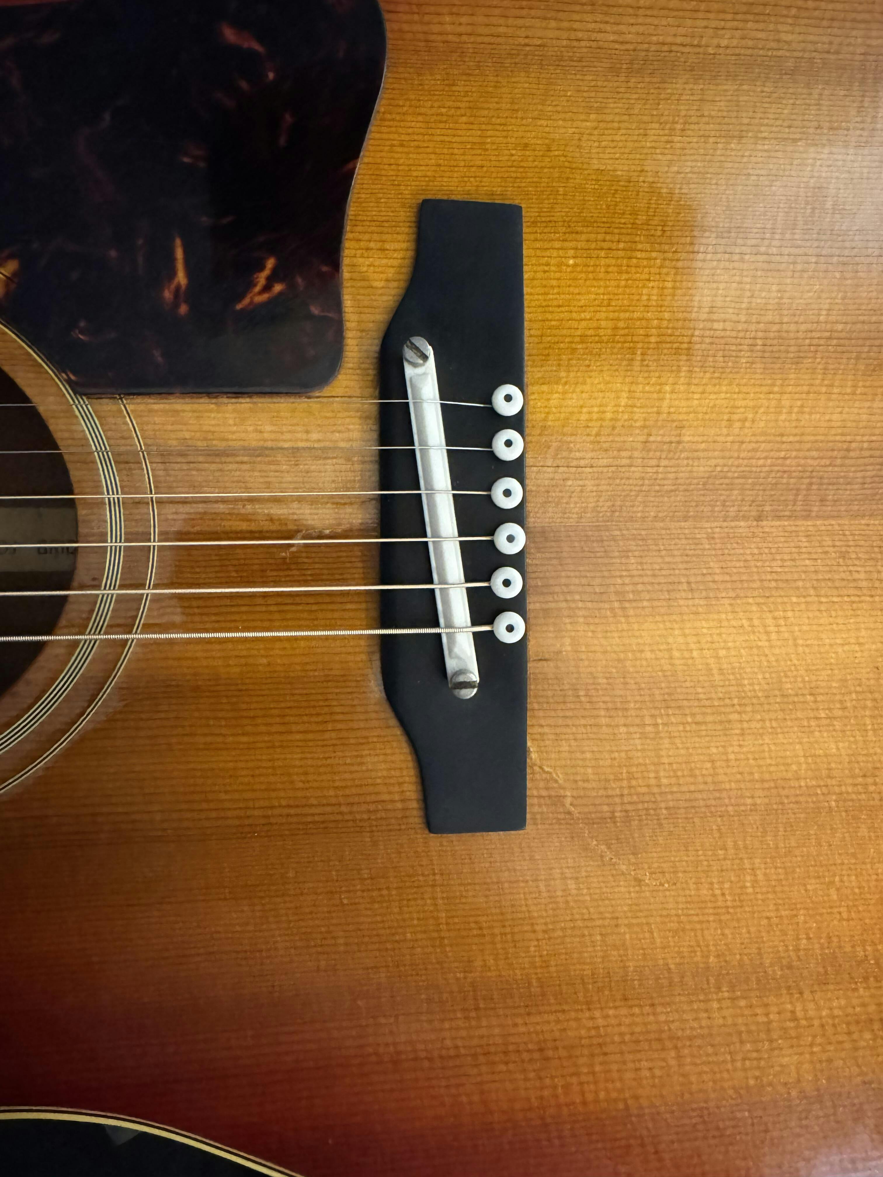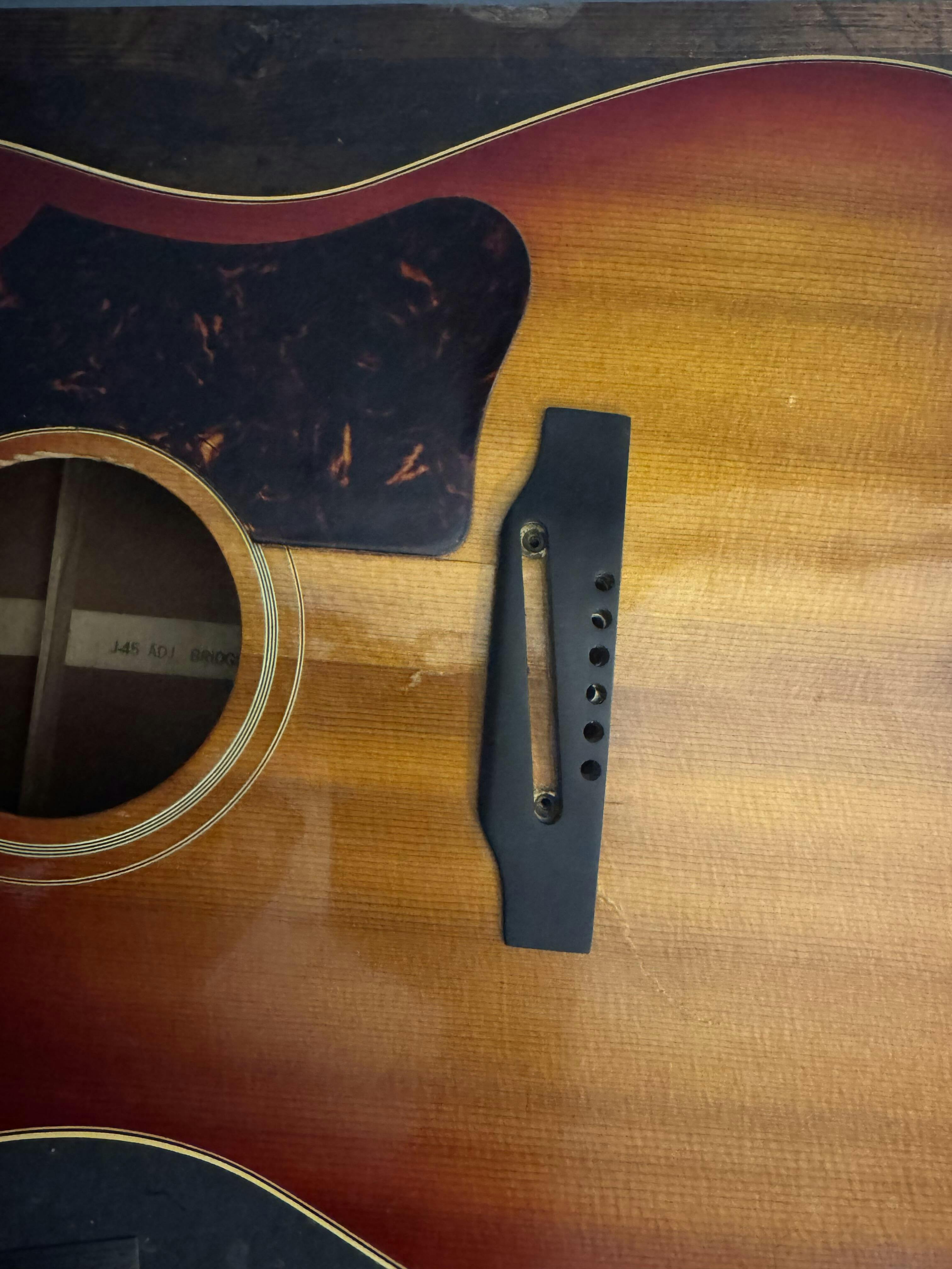 Many early to mid 1960s Gibson flat top acoustics featured a plastic bridge and adjustable saddle, allowing for quick string height adjustments. These were held to the top with 4 screws. Over the ensuing 60 years, most of these original injection-molded plastic bridges have cracked and warped as the material aged. Many featured a wide Ceramic Saddle which creates a wonderful clear tone that has regained a considerable following for its special sound.