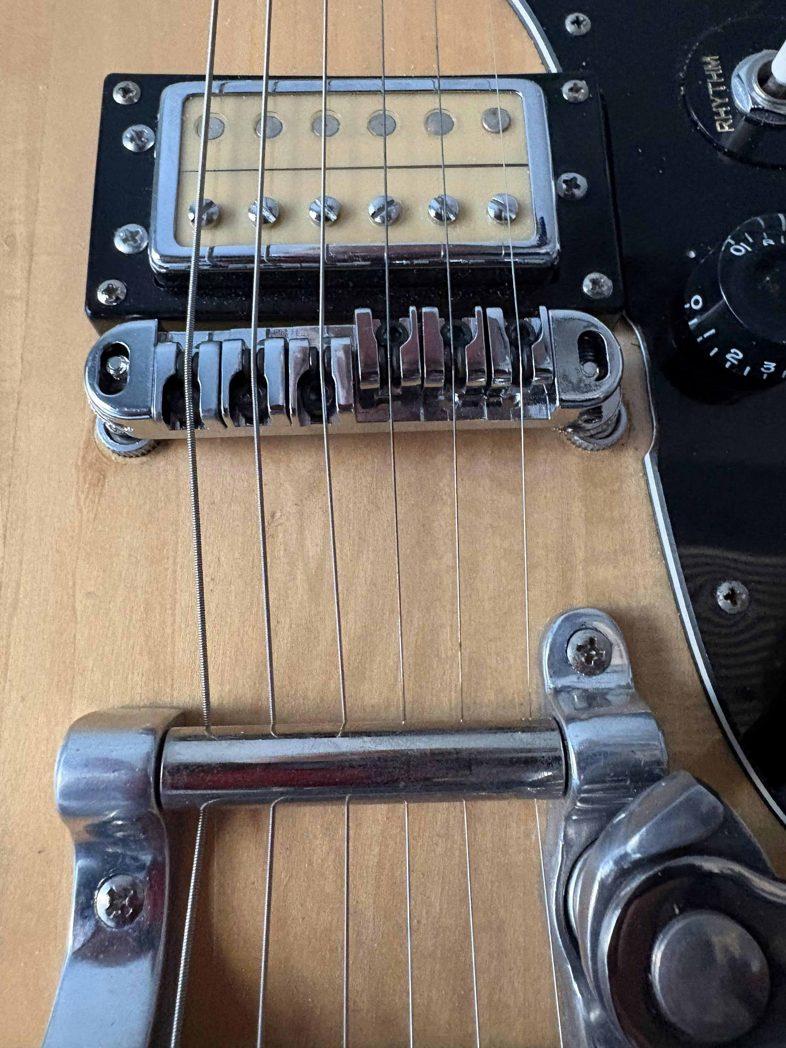 These models were often equipped with a lightning bar/wraparound tailpiece and a Lyre vibrola tremolo system.  This creates several previously unsolvable problems.