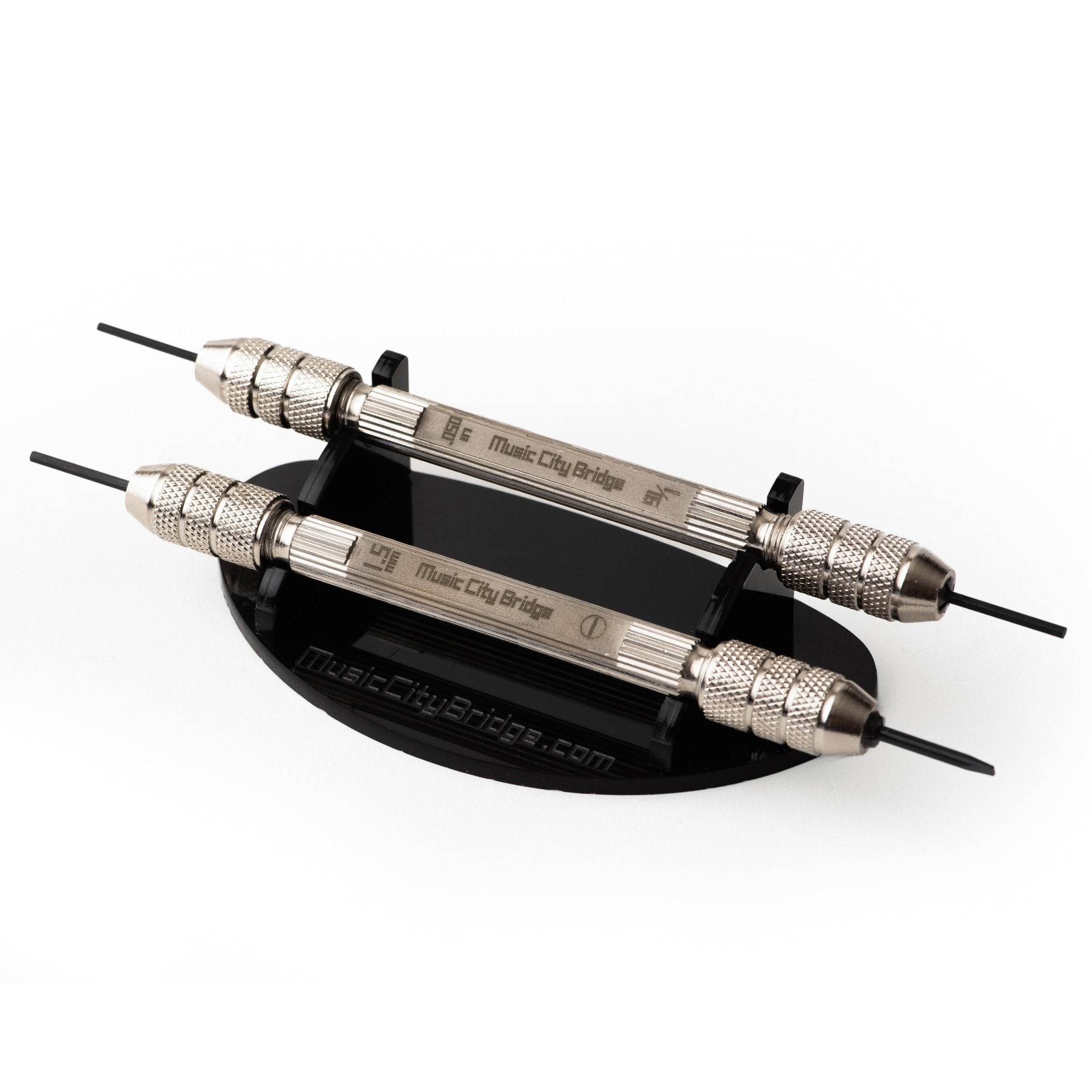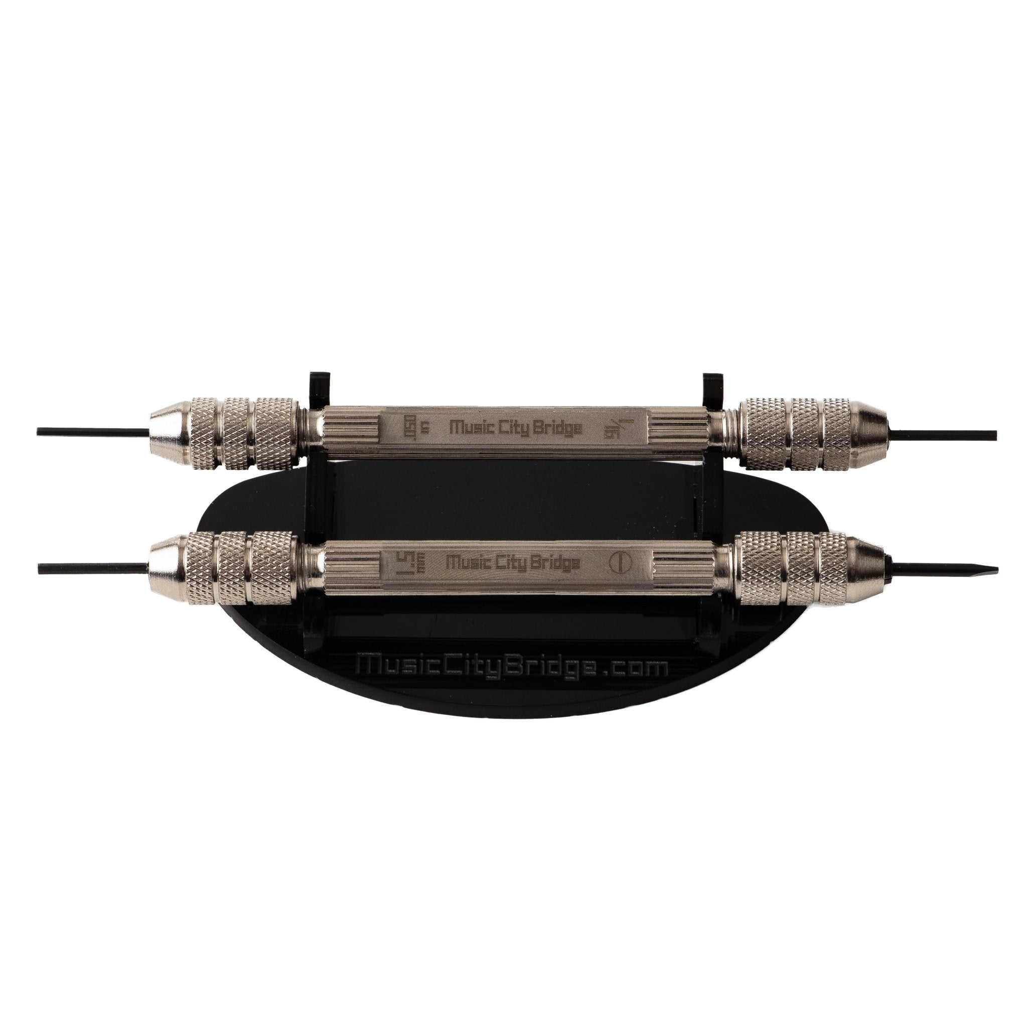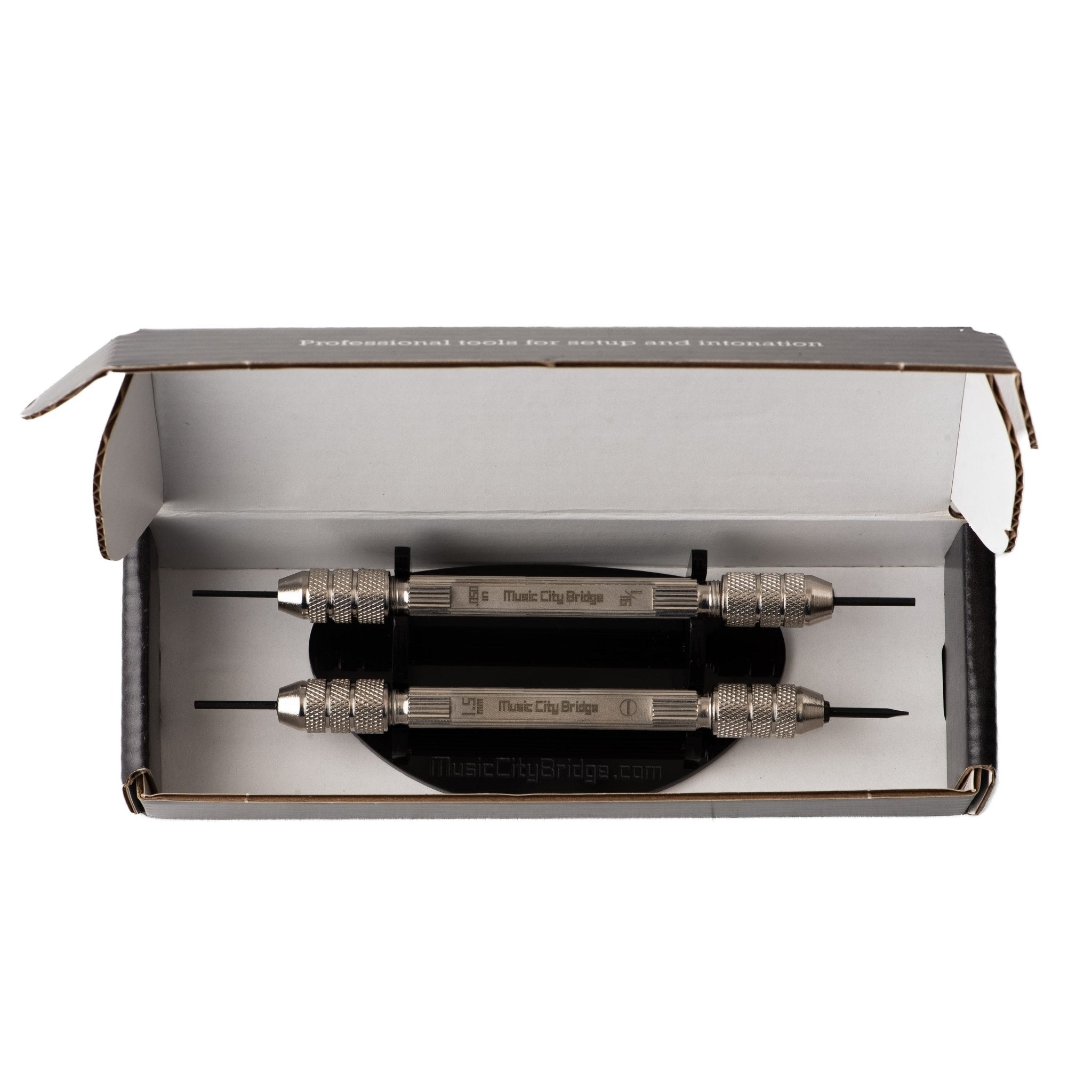 The set contains two double-ended Saddledrivers with the most common bridge and saddle tools at each end. This kit is virtually all you need for electric guitar and bass bridge adjustments.