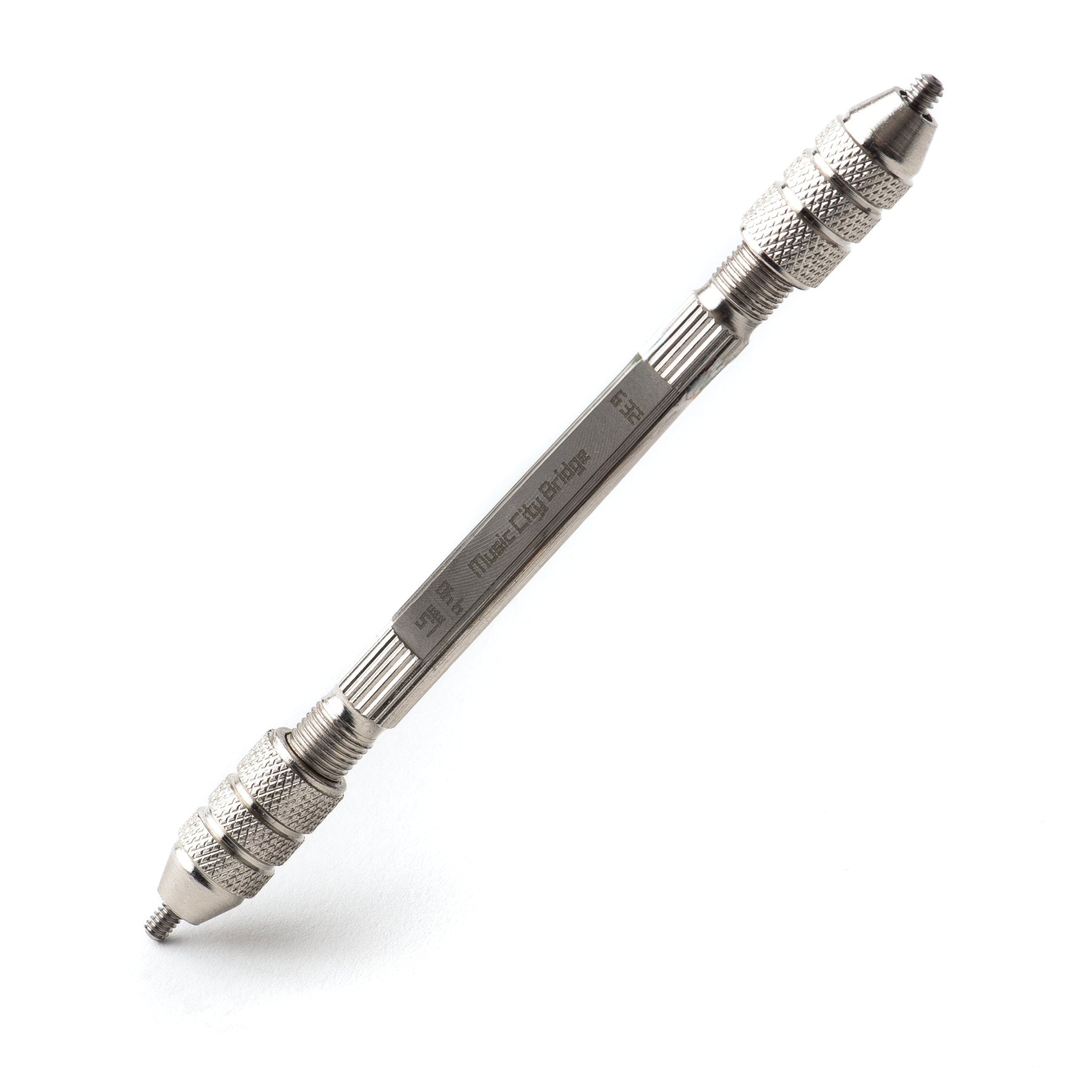 The Music City Bridge Screw Trimmer is the simple solution to burned fingers and hard-to-hold set screws, which used to make trimming the too-tall saddle screws as bad as the torn and raw palms they cause. The screw trimmer firmly holds any size set screw - 4-40, 6-32 or the metric M3x 0.5 - while you trim it to length and round its new end against a sander.