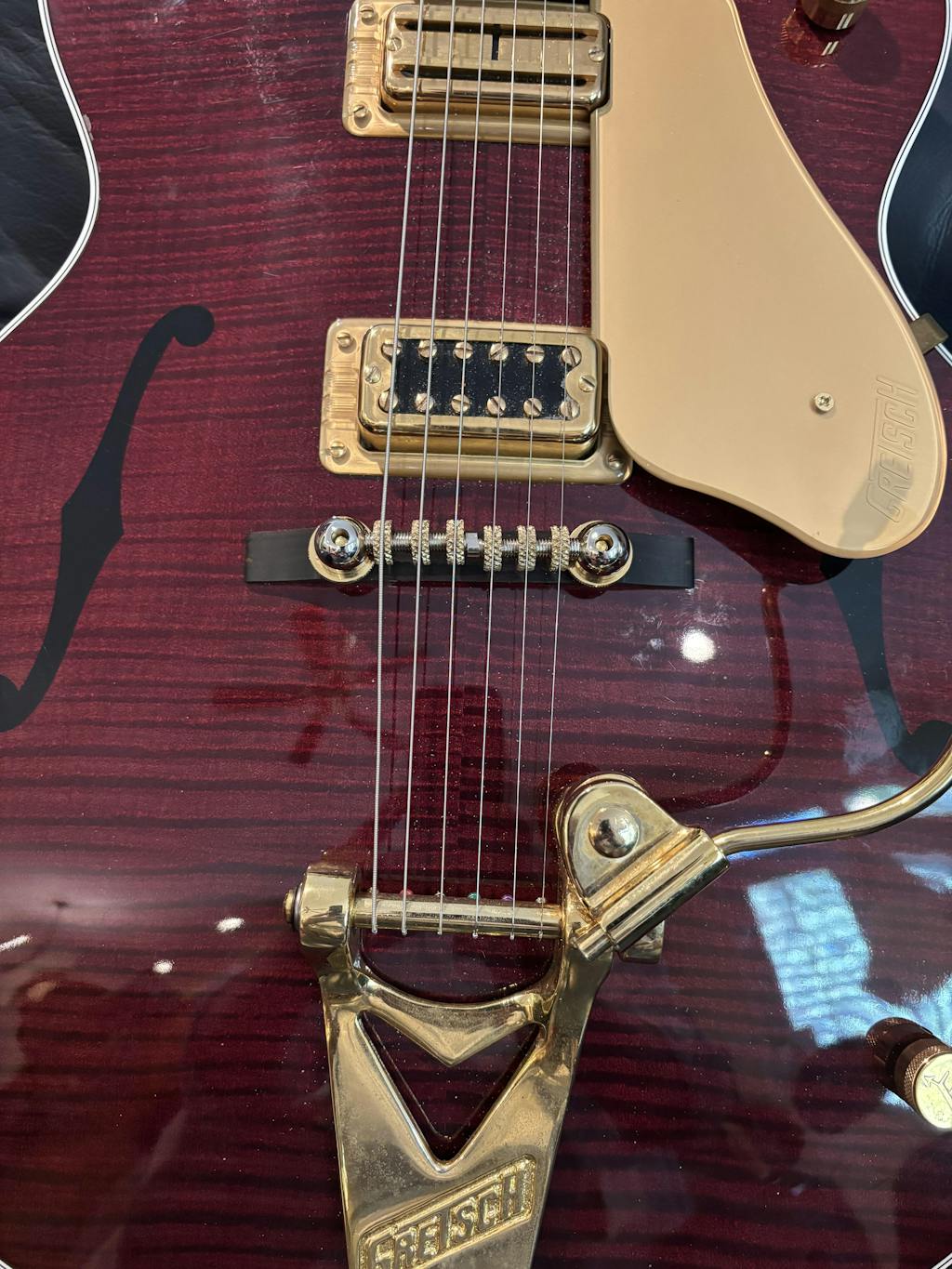 As a fixture on many Gretsch models over the decades, the Space-Control bridge provides each string with a transversing (side to side) adjustment, making it possible to set string spacing manually.